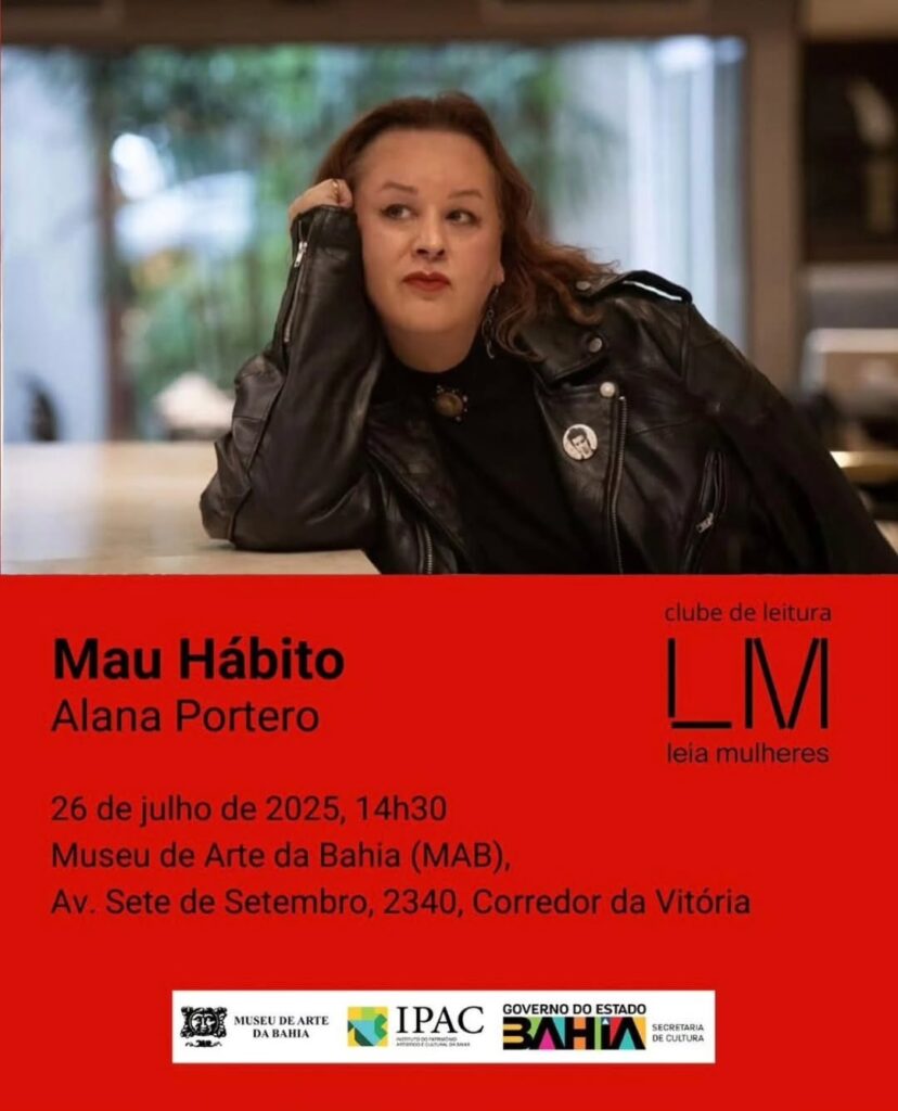 O encontro do mês de julho do Clube de Leitura Leia Mulheres será neste sábado (26), às 14:30h, no MAB – Museu de Arte da Bahia. O evento é gratuito e sem inscrição prévia. O livro é “Mau hábito”, romance de estreia da escritora e poetisa espanhola Alana Portero.