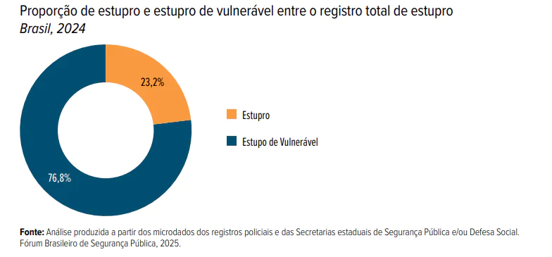 Segundo o Anuário Brasileiro de Segurança Pública de 2024, o país registrou 87.545 casos de estupro e estupro de vulnerável, o maior número desde o início da série histórica, em 2011. A Bahia registrou 5.323 casos, atrás de São Paulo (14.579), Paraná (7.918), Rio de Janeiro (5.819), Minas Gerais (5.642) e Goiás (5.379). A análise dos dados mostra que meninas representam 87,7% das vítimas e que, entre elas, 33,9% tinham entre 10 e 13 anos. No caso dos meninos, os dados se concentram entre 5 e 9 anos.