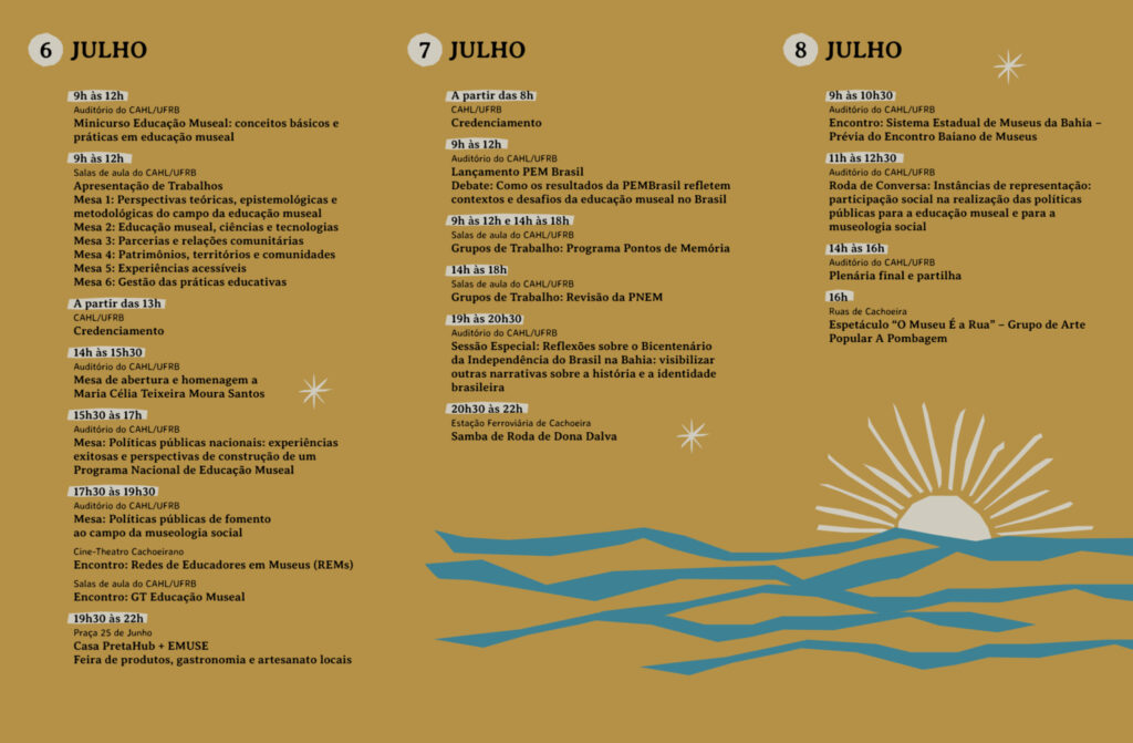 Além disso, a escolha de Cachoeira para sediar o evento se deu com intuito de afirmar o compromisso com a diversidade de memórias, patrimônios e histórias na educação museal, uma vez que o munícipio foi palco de lutas e movimentos populares que culminaram na Independência do Brasil na Bahia.