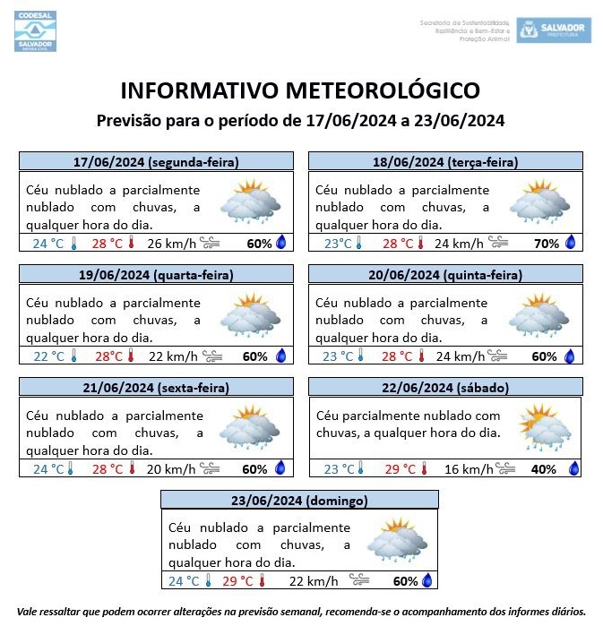 Entre esta segunda (17) e a sexta-feira (21), o céu deve permanecer de nublado a parcialmente nublado, com 60% a 70% de chuvas fracas, por vezes moderadas, a qualquer hora do dia.