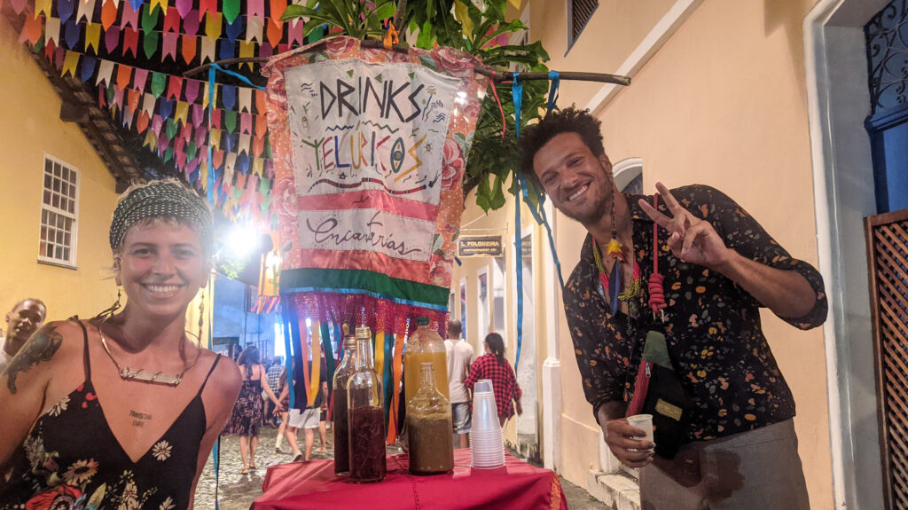 O comércio é um dos pontos principais para movimentar a economia da cidade de Salvador neste período junino, desde as vendas mais tradicionais como o milho, amendoim, bolo de aipim e canjica até os mais inusitados como licor de hibisco com gengibre. Para os “mochileiros” e turistas Runa Salata e Carlos Dias apostar em novos sabores da bebida mais tradicional do São João é fazer com que outras pessoas experimentem produtos naturais e sem açúcar, que é um grande desafio nas vendas. Mas o que chama atenção da dupla mesmo é a simpatia e o local atípico que escolheram para vender, segundo eles, o São João da capital e dos interiores são os maiores do Brasil, e fazer uma grana extra para continuar viajando é o principal objetivo.